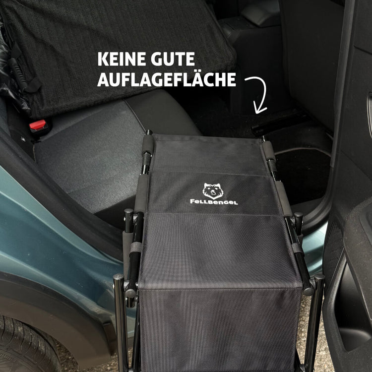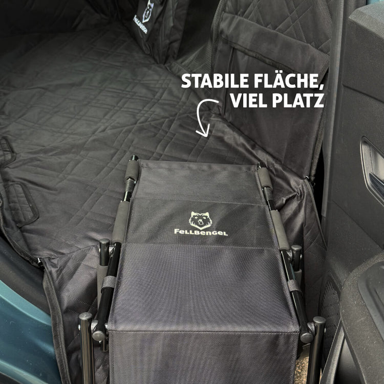 Um die Fellbengel Hundetreppe für die Rückbank gut auflegen zu können, braucht man eine stabile gerade Fläche. Genau das bieten die festen Bodenplatten unseres Rücksitzschutzes.